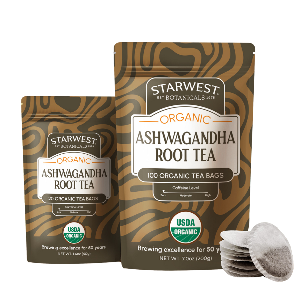 Discover the serenity of nature with Starwest's Organic Ashwagandha Root Tea Bags. Revered in Ayurvedic traditions, Ashwagandha is an adaptogen that supports your body’s response to stress, helping you find balance and calm in a fast-paced world*. With every sip, experience the earthy richness of a tea rooted in centuries of herbal wisdom. Starwest Botanicals has been brewing excellence for 50 years, and our Ashwagandha Tea is yet another testament to our commitment to quality and wellness.