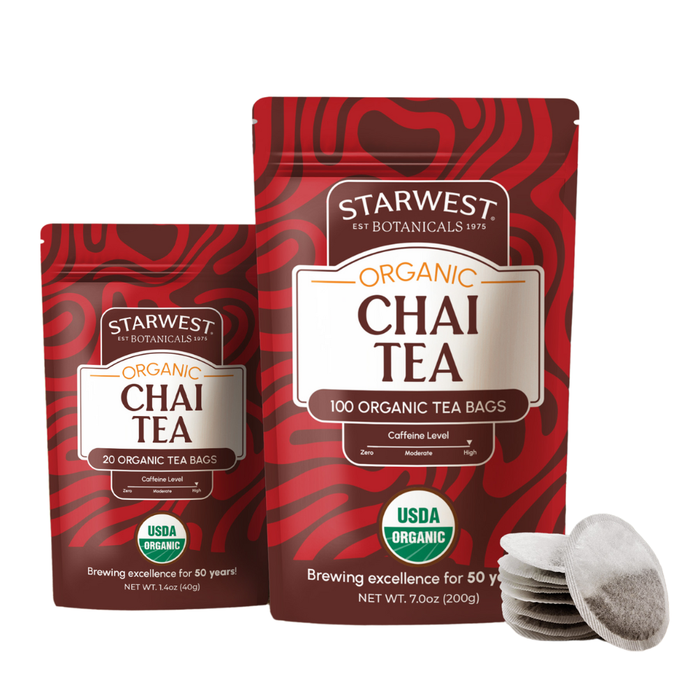 Awaken your senses with the exotic flavors of Starwest's Organic Chai Tea Bags. A carefully balanced blend of organic China Black F.O.P. Tea and aromatic spices like cinnamon, cardamom, and ginger, this chai offers a bold and spicy flavor that energizes and comforts. Start your day with warmth and the invigorating aromas of chai spices. At Starwest Botanicals, we’ve been brewing excellence for 50 years, and our Chai Tea is a reflection of our passion for quality and authentic flavor.