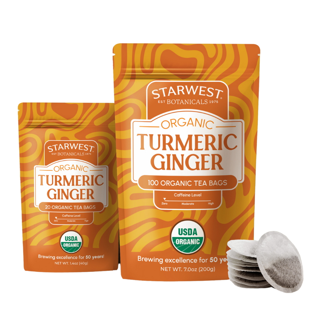 Discover the golden goodness of Starwest Botanicals' Organic Turmeric Ginger Tea Bags. Revered for its soothing and antioxidant properties, turmeric ginger tea has been used for centuries to support an optimal inflammatory response. With its earthy flavor and bright color, this caffeine-free tea brings warmth and wellness to your daily routine. Starwest Botanicals has spent 50 years perfecting the art of blending, ensuring that every sip of our Organic Turmeric Ginger Tea supports your well-being with the finest organic ingredients.